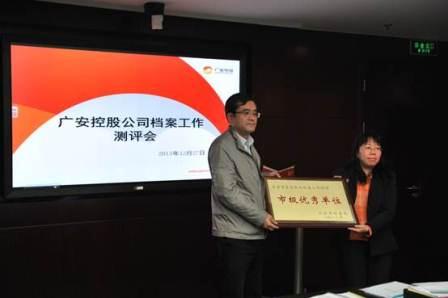 2013年12月27日,西城區(qū)檔案局副局長金梅、法制科科長李世欣、檔案局指導科科長周旭輝、指導科副科長辛妍,到我公司進行《北京市區(qū)縣機關(guān)檔案工作測評》檢查。檢查結(jié)束后對公司的檔案工作給予好評及肯定,希望公司更完善全面的完成檔案歸檔工作。金梅副局長向張曉陽總經(jīng)理頒發(fā)了檔案“市級優(yōu)秀單位”獎牌。