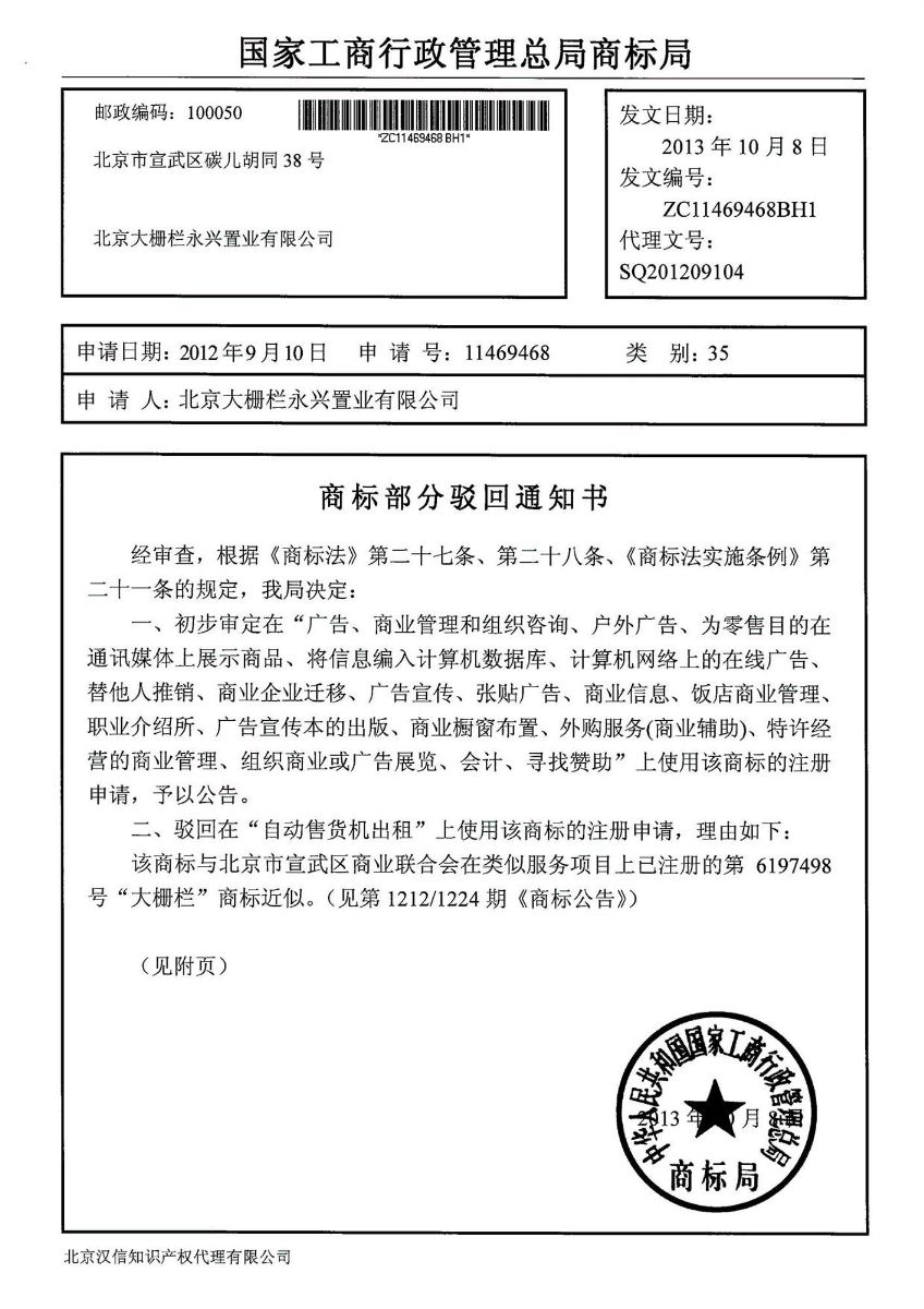 在永興置業(yè)申請的35類注冊“大柵欄圖形”商標(biāo)中除“自動售貨機出租”這一項駁回,其余20項(1、廣告;2、廣告宣傳;3、計算機網(wǎng)絡(luò)上的在線廣告;4、戶外廣告;5、廣告宣傳本的出版;6、商業(yè)櫥窗布置;7、為零售目的在通訊媒體上展示商品;8、張貼廣告;9、商業(yè)信息;10、組織商業(yè)或廣告展覽;11、飯店商業(yè)管理;12、外購服務(wù)(商業(yè)輔助);13、商業(yè)管理和組織咨詢;14、特許經(jīng)營的商業(yè)管理;15、替他人推銷;16、職業(yè)介紹所;17、商業(yè)企業(yè)遷移;18、將信息編入計算機數(shù)據(jù)庫;19、會計;21、尋找贊助)已經(jīng)通過初審。